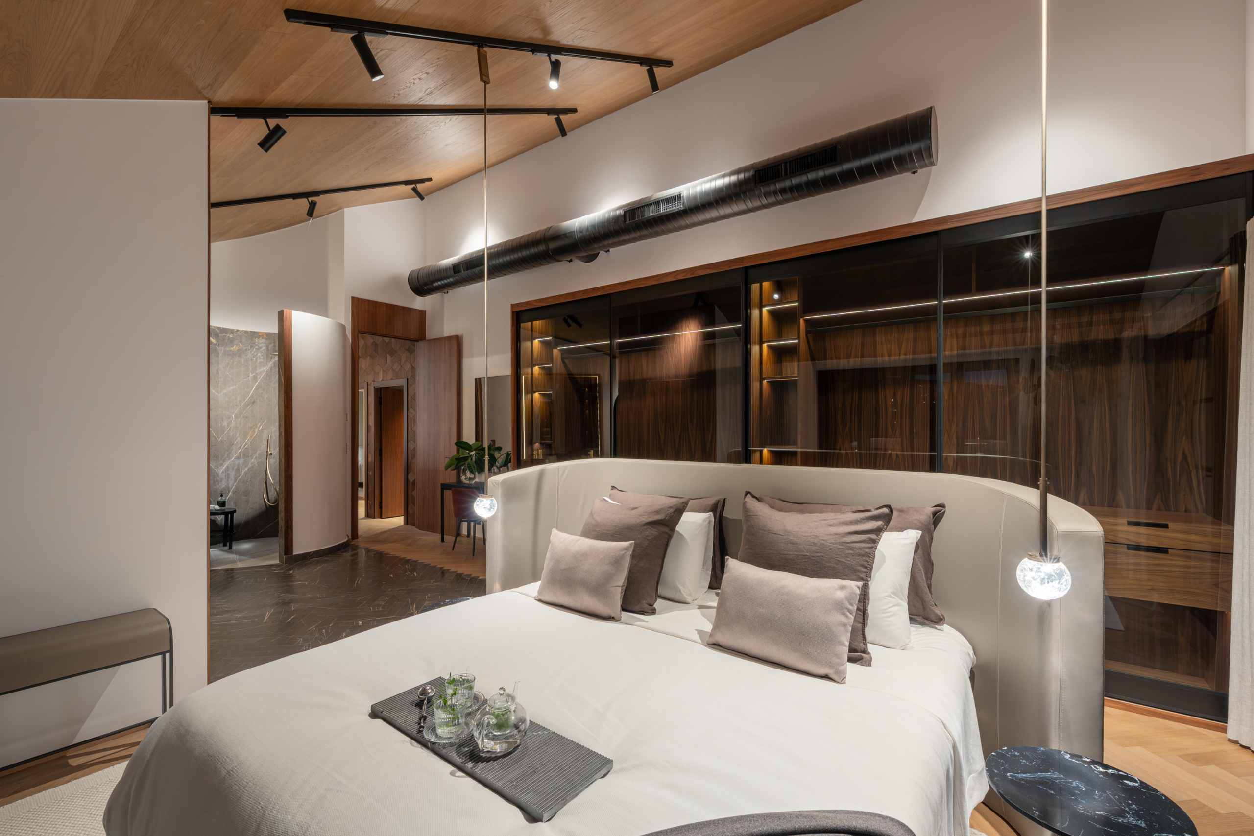 Upstairs, the principal suite benefits from vaulted timber ceilings, open dressing, sculptural stone basins and a walk-in marble shower. Full-height glazing frames the views to the golf and sea, while maintaining privacy. The additional bedrooms follow the same standard of finish and proportion, each thoughtfully designed to maximise comfort. Practical elements, such as a separate utility room, integrated wine storage, custom carpentry and layered lighting, are integrated discreetly throughout.