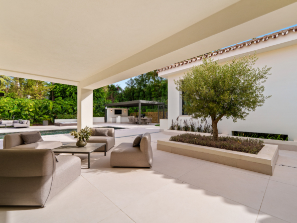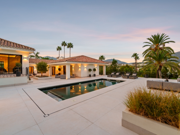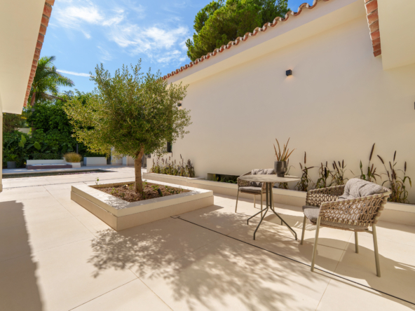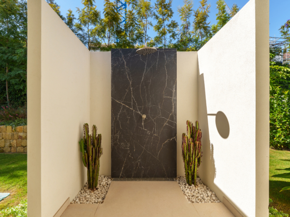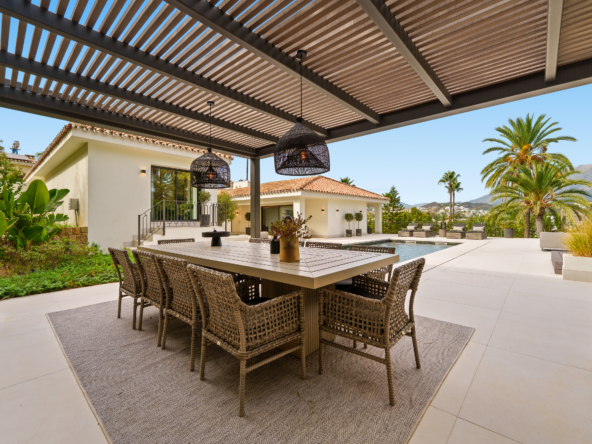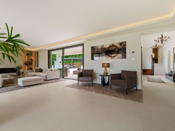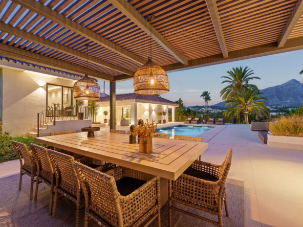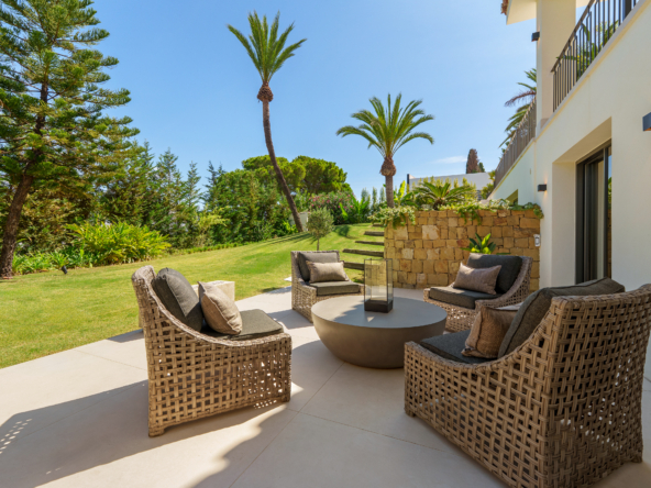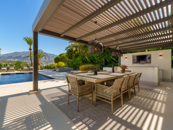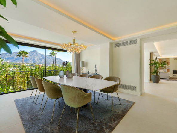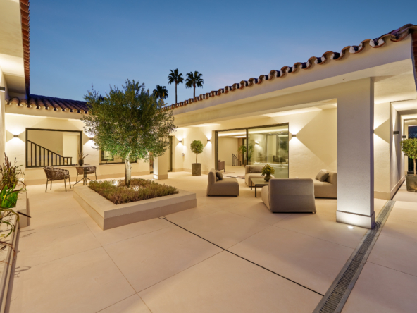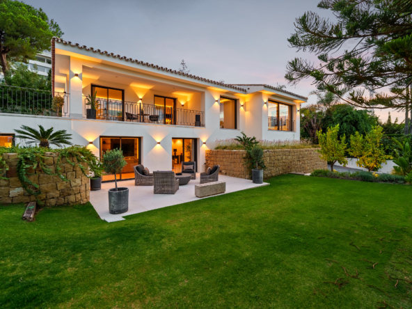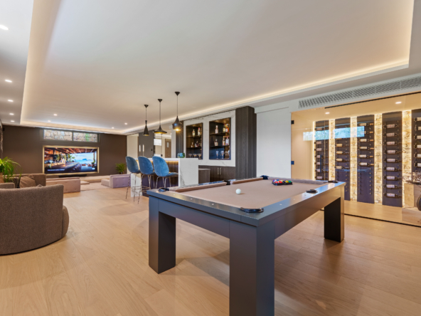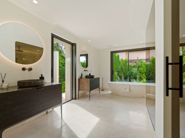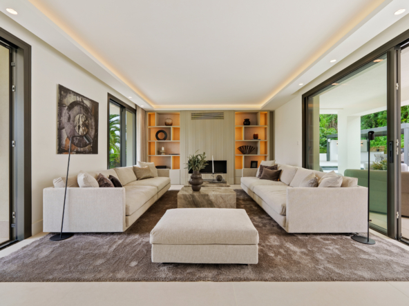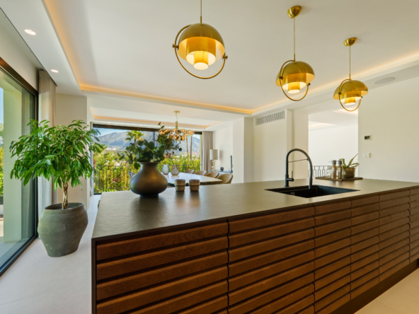 Occupying an impressive 648 square meters over three levels, this villa offers an abundance of natural light and breathtaking views from nearly every room. The property is fully equipped with top-tier Siemens appliances and features exquisite oak flooring that complements its warm, contemporary style. The ground floor of Brisas 12 is meticulously designed to foster a welcoming atmosphere. A spacious kitchen with a dining area seamlessly transitions into a cozy living room. Additionally, this level includes a guest room with an en-suite bathroom and an extra guest toilet, ensuring functionality and privacy