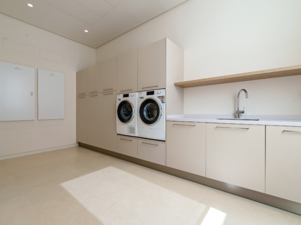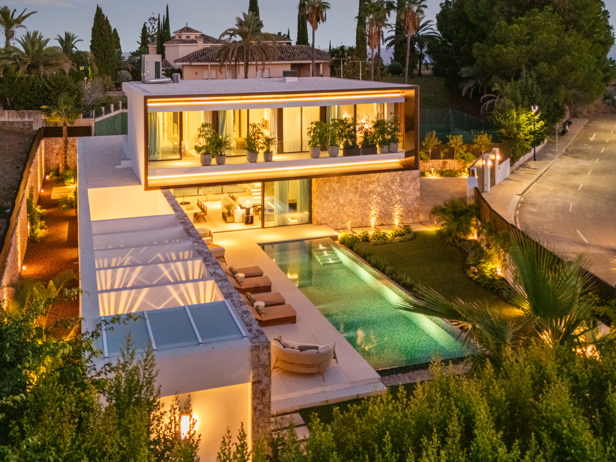 The layout of Casa Cazorla is delicately planned, seamlessly dividing spaces for both privacy and social living. Upon entering, you are greeted by a generous open-plan living room and dining area, complemented by a light-wood kitchen that overlooks the social heart of the home. Floor-to-ceiling glass doors open to expansive terraces and a landscaped garden, inviting natural light and the outdoors in. This level also offers a private guest suite with its own terrace access, ensuring comfort and independence for visitors. Upstairs, three serene bedrooms include two guest suites opening onto the terrace, and a master suite featuring a walk-in closet and a luxurious bathroom with a rain shower and bathtub.The lower level of Casa Cazorla is dedicated to wellness and relaxation. Here, you can unwind in the spa and hammam, stay active in the home gym, enjoy a glass of wine in the wine room, or focus in your private home office. This floor also includes a playroom and an additional en-suite