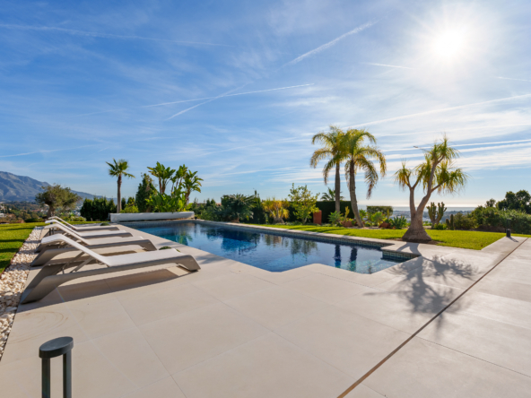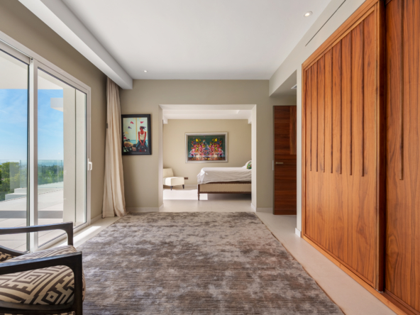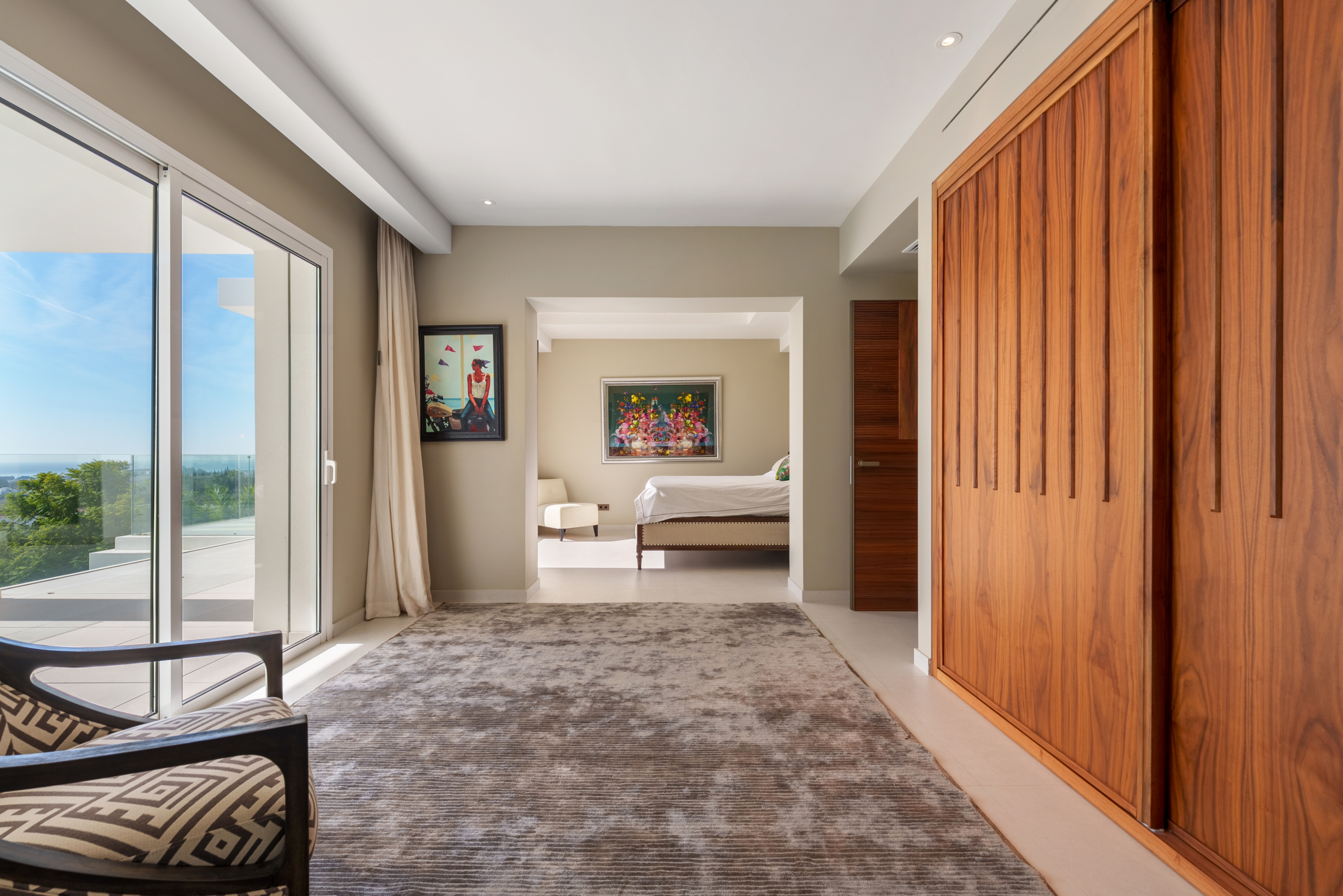 A south-facing villa in Puerto del Almendro, Benahavís with nine bedrooms and nine en-suite bathrooms, arranged across a main residence and an independent guest house on a 7,881 m²plot, offering approximately 1,177 m² of built space, 140 m² of terraces, two outdoor swimming pools, and far-reaching sea and mountain views across the Mediterranean coastline.