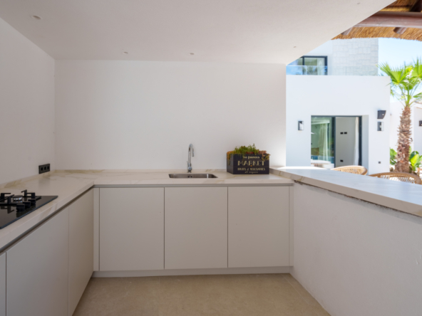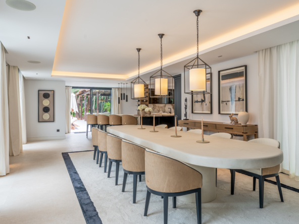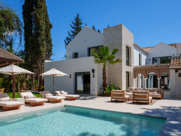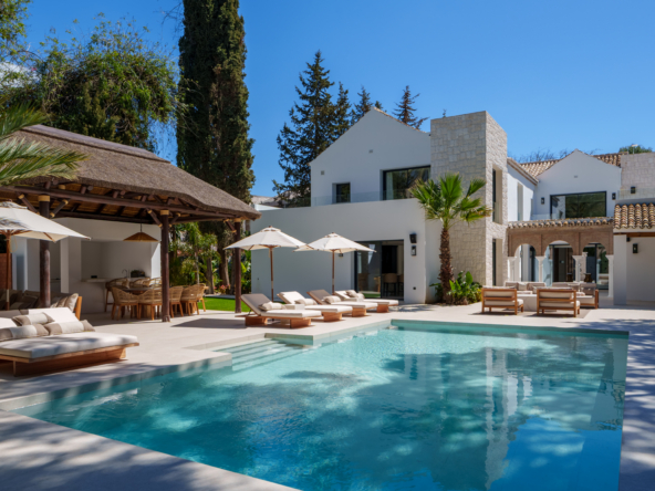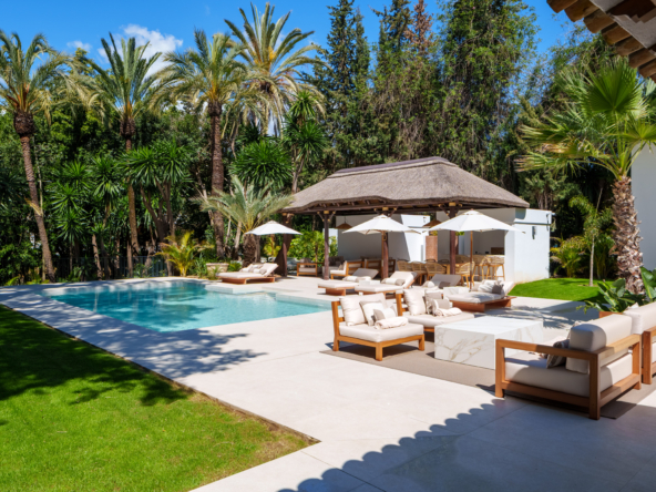 Villa Las Palmeras is nestled within the exclusive enclave of Las Brisas in Nueva Andalucia. This brand-new epitomises sophistication and comfort. Spanning 983m2, this architectural marvel is poised majestically on an expansive 2560m2 plot, , enveloped by a manicured garden and offering plenty of privacy.
