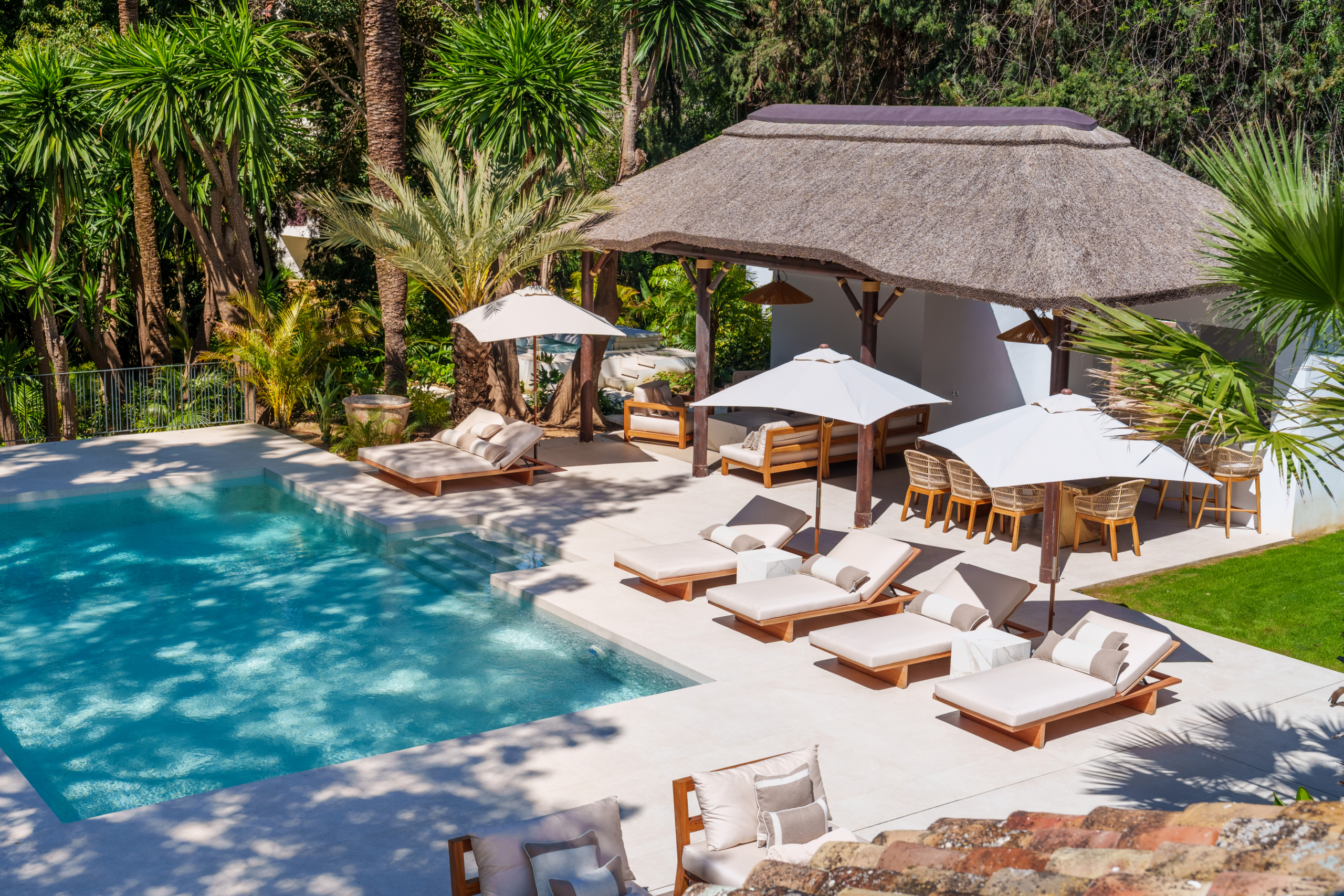 Embracing the essence of Andalusian charm, Villa Las Palmeras also offers timeless elements such as a charming patio, an outdoor master shower boasting panoramic views of the surrounding golf course. Also, there is not one, but 3 distinct TV rooms available.