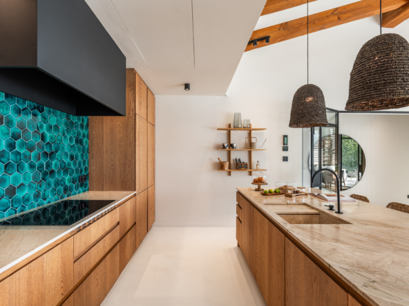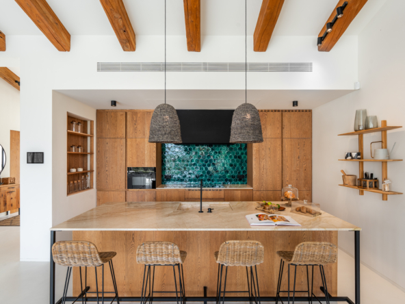 Set directly on the fairway, the villa is built around its views, with nothing interrupting them. Glass walls slide away completely, drawing the outdoors into the living space and allowing each area to open with intent. The main level is structured yet fluid, with an open plan living area centred around a floating fireplace, a kitchen with a bar designed for informal use, and a dining space that extends naturally onto the terrace. Outside, the heated infinity pool runs parallel to the views, while a rising wooden solarium and pergola with outdoor kitchen create defined zones without closing the space. A separate garden lounge and a discreetly positioned Jacuzzi offer quieter areas without disconnecting from the overall layout.